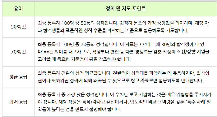 학생들이 가장 많이 혼동하는 입시 결과 용어를 명확히 지도하고, 각 지표를 전략적으로 활용하는 방법을 안내해야 합니다.