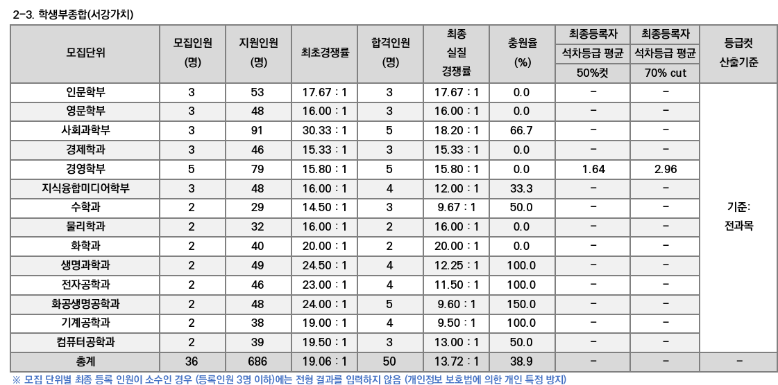 지도 포인트: 수능 최저학력기준이 있는 전형의 경우, 최초 경쟁률과 실질 경쟁률의 차이가 극적으로 벌어지는 경우가 많습니다. 서강대학교 컴퓨터공학과(2025학년도)의 경우 최초 19.5:1에서 실질 13:1로 감소한 사례처럼, 학생의 실질적인 경쟁 강도를 파악하기 위해 반드시 확인해야 할 핵심 지표임을 강조해야 합니다. (단, 모든 대학이 이 수치를 공개하지는 않으므로 '대학어디가' 포털이나 각 대학 입학처 홈페이지 확인이 필요합니다.)