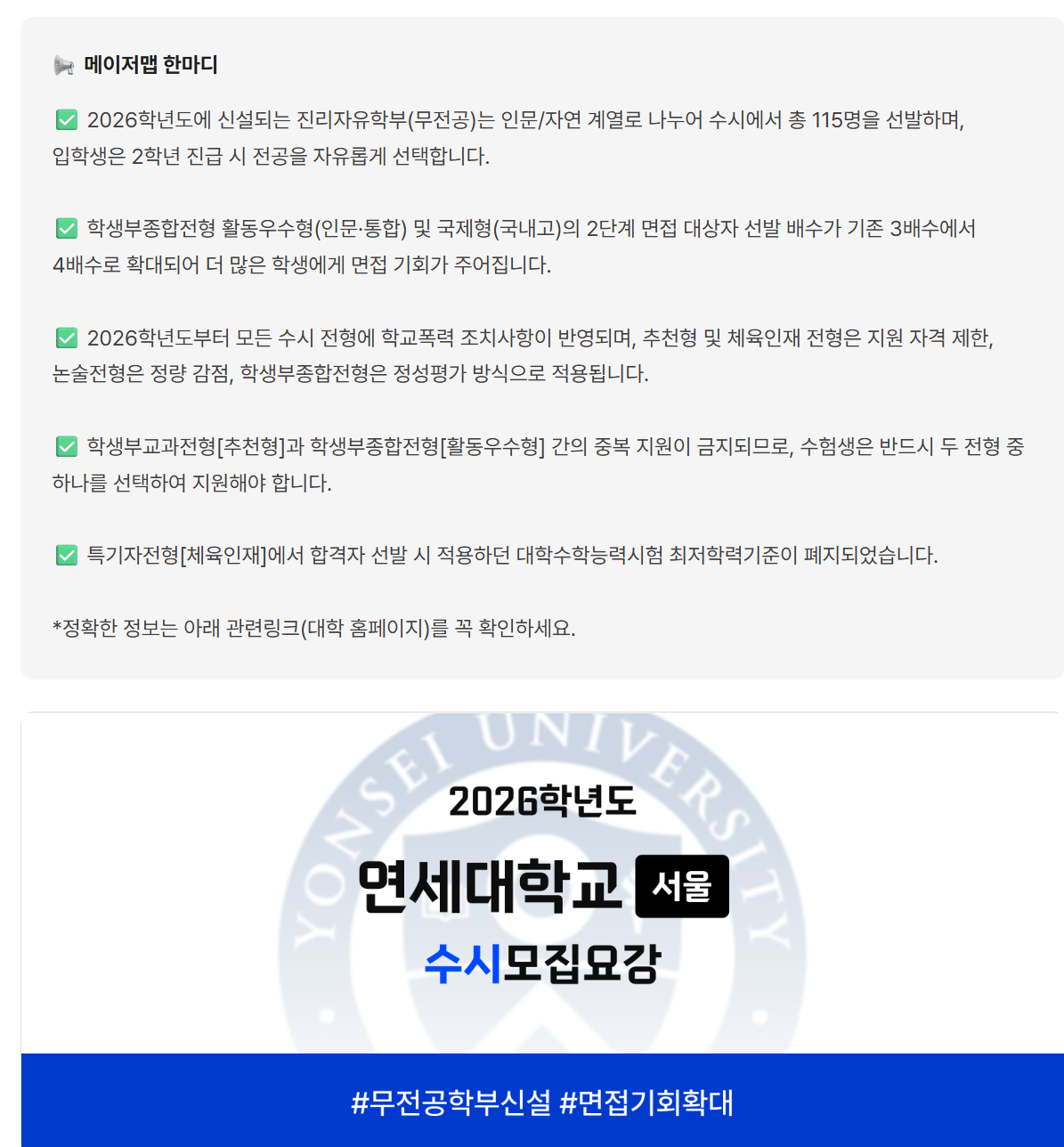 혹시 학생이 복잡한 입시 전략 앞에서 막막해한다면, '이것만이라도 제대로 알고 지원하자!' 는 마음으로 오늘 뉴스레터 내용을 지도해주시면 어떨까요?