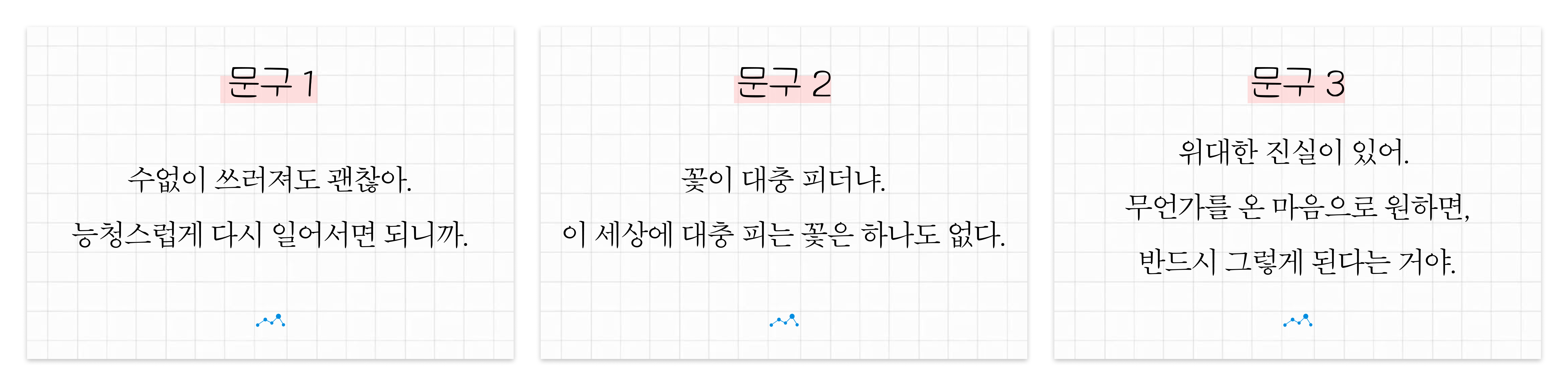 1. ์ ์๋ 3๊ฐ์ ๋ฌธ๊ตฌ ์ค 1๊ฐ๋ฅผ ๊ณจ๋ผ ์๊ธ์จ๋ก ์์ฑํ๋ค.